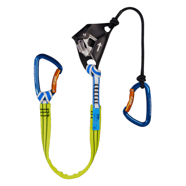 • 1 corde élastique noire de 1m servant à maintenir la tension entre le harnais et le bloqueur